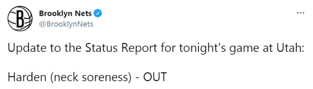 24直播网讯北京时间3月25日,篮网官方更新了对爵士一战的伤病报告。哈登(脖子酸痛)将无缘出战这场比赛,算上哈登,一共有六名篮网球员将无缘本场比赛。此前,篮网已经宣布格里芬(左膝伤病管理)、欧文(个人事务)、杜兰特(左腿筋拉伤)、沙梅特(右踝扭伤)、丁威迪(右膝韧带部分撕裂)不会打这场比赛。