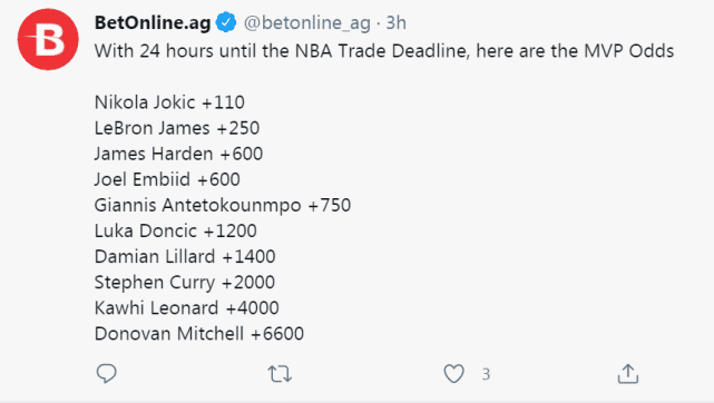 24直播网讯 北京时间3月25日,距离交易截止日不到一天了,NBA本赛季的常规赛MVP赔率更新。掘金中锋约基奇(+110)排名联盟第一,湖人球星詹姆斯(+250)位居第二,此前排名靠后的哈登已经升至第三,和恩比德并列,同为+600。