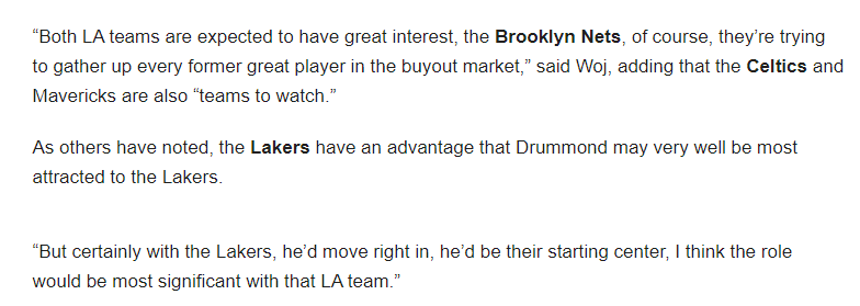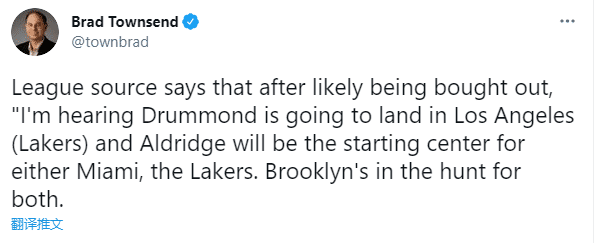 另一记者Brad Townsend透露,一旦庄神和骑士达成买断协议,德拉蒙德将会加盟洛杉矶湖人,并且成为湖人首发中锋,阿尔德里奇将在买断后加盟热火,而这两人都是篮网的目标人物。