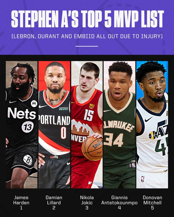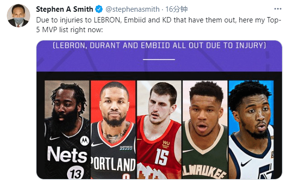不管是个人数据还是球队战绩,哈登都已成为常规赛MVP的争夺者;名嘴“美国杨毅”史密斯发推表示:由于詹姆斯、杜兰特和恩比德三大巨星因伤被淘汰出局,他列出自己心目中的五大MVP候选人,依次是哈登、利拉德、约基奇、字母哥和米切尔;哈登成为史密斯心目中的MVP的头号热门。