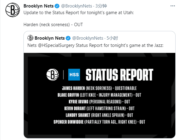 24直播网3月25日讯 篮网客场背靠背对阵爵士,杜兰特和欧文都没有随队出征,格里芬因负荷管理缺席比赛,哈登(颈部酸痛)也因伤缺阵,篮网官方已经宣布这样的伤病报告;哈登终于再次轮休,篮网生涯第二次缺席比赛,篮网三巨头全都无缘对阵联盟第一。