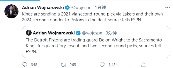 24直播网3月25日讯 交易终于来了,据ESPN名记报道,活塞把德朗-赖特交易到国王,换来约什-约瑟夫和两个次轮选秀权,国王送出来自湖人的2021年二轮签和自己2024年二轮签;因此一笔1换3交易达成,这意味着各种大交易要来了。
