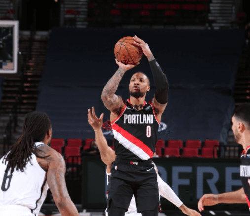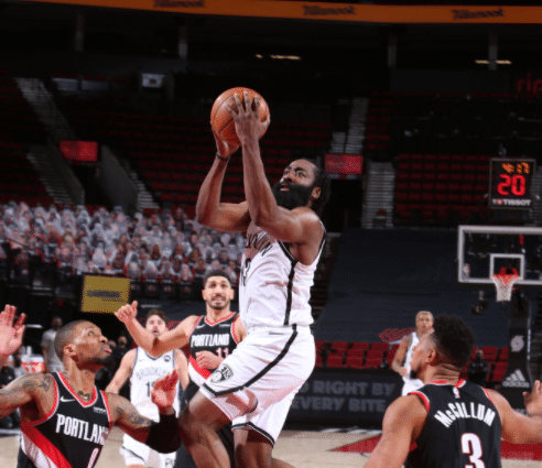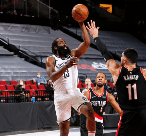 24直播网3月24日讯,NBA常规赛篮网对阵开拓者,篮网方面欧文和杜兰特均缺席比赛,哈登带伤上阵,开拓者随着麦科勒姆的回归,球队进攻火力出色,防守端依旧是他们最大的问题