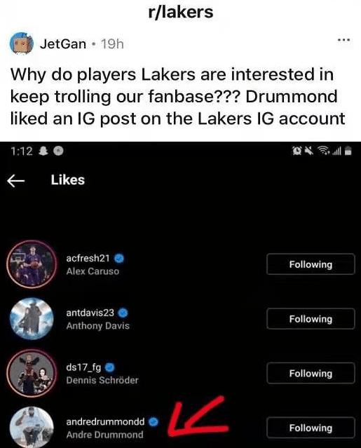 有记者在推特上晒出一张趣图并写道:“送给那些问我德拉蒙德会不会加入湖人的人。”图中一群人围着雷-阿伦,阿伦旁边有个人举着牌子,牌子上写着:“他现在还不知道!”德拉蒙德本人转发并附上三个笑哭的表情,与此同时他还在社媒上频繁点赞湖人动态,这很可能是在示好!
