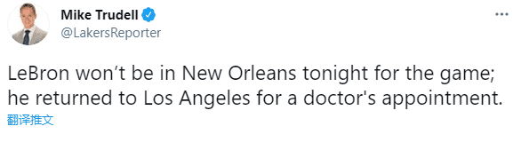24直播网3月24日讯 湖人客场对阵新奥尔良鹈鹕,詹姆斯已经暂时离开球队,据湖人跟队记者Mike Trudell报道,勒布朗-詹姆斯不在新奥尔良,他已经返回洛杉矶接受医生的治疗,湖人官方宣布这一消息。