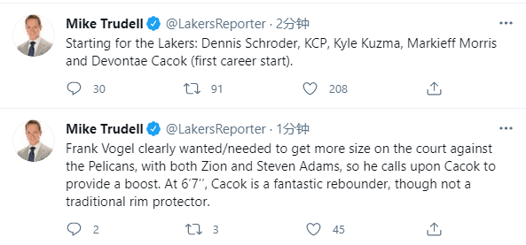湖人对阵鹈鹕,全队将会身穿致敬埃尔金-贝勒的白色战袍,此前湖人传奇人物贝勒逝世,享年86岁,湖人将再次向传奇致敬;本场比赛湖人再次变阵,首发五虎是施罗德、波普、库兹马、大莫里斯和卡考克(生涯首次首发),沃帅变阵能受到奇效吗?