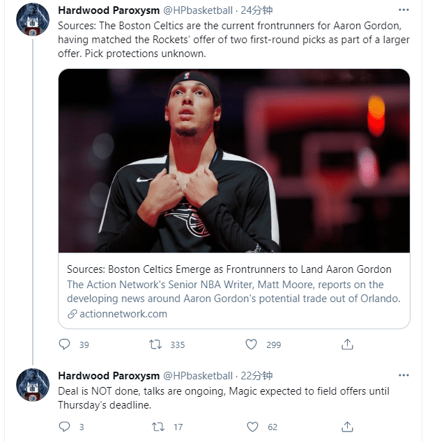 24直播网3月23日讯距离交易截止日还有三天,各种大交易要来了,目前魔术球星阿隆-戈登已经正式请求交易从而离队,火箭、凯尔特人等队都有意戈登,凯尔特人领跑戈登争夺战;据名记报道,魔术索要筹码曝光——两个首轮选秀权和一位年轻球员。