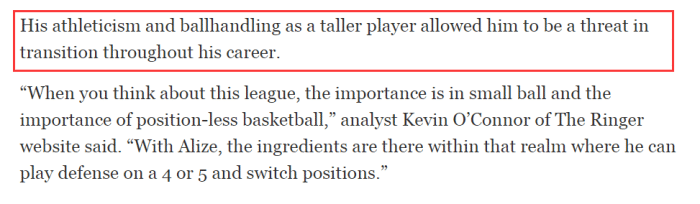The Ringer名记凯文-奥康纳还称赞了约翰逊的防守,称他可以在小球阵容中打4号位或者5号位,而且具备不错的换防能力。
