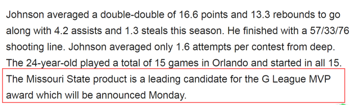 签约篮网前,他在G联赛的猛龙905队打了15场比赛,场均16.6分13.3篮板4.2助攻1.3抢断,投篮命中率57%。美媒报道称,约翰逊是今年G联赛MVP的大热门,而这一奖项将在明天揭晓。约翰逊最终和篮网签约,美媒报道称魔术、猛龙、火箭、马刺和太阳也都曾有兴趣签下他。