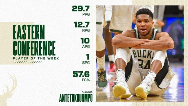 字母哥上周率领雄鹿打出3胜0负的佳绩,场均29.7分12.7篮板10助攻,投篮命中率58%,三分命中率33%,罚球命中率81%。这是字母哥本赛季第三次当选周最佳,也是个人生涯第16次当选。