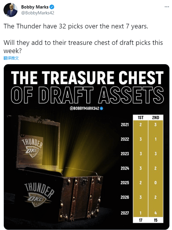 24直播网3月23日讯 ,距离NBA交易截止日已经只剩下3天时间,各队也都希望在最后时刻进行补强或者交易。而对于本赛季无欲无求的雷霆来说,他们甚至可能会继续出售球员囤积选秀权。NBA薪资专家Bobby Marks晒出了雷霆在未来7年的选秀权,竟然达到了疯狂的32个!NBA头号“屯粮”大队,实至名归。