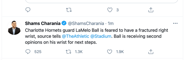 24直播网3月22日讯 ,根据名记Shams爆料,拉梅洛·鲍尔可能遭遇手腕骨折,预计会赛季报销。目前三球还在寻求诊断的第二意见。目前黄蜂更新了鲍尔的伤病报告,他将再度接受伤病评估,目前是无限期缺阵。对于黄蜂而言,这无疑是遭遇重创。