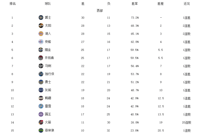 勇士昨天输给灰熊,他们也错失升入前八的机会。灰熊昨日复仇勇士,战绩来到19胜20负。鹈鹕今天险胜掘金,爆出冷门,他们也在全力冲击附加赛的区域。雷霆的战绩和鹈鹕是一样的,他们落后前八4.5个胜差。国王的战绩是17胜25负,这个赛季国王的表现波动很大。火箭输给了雷霆,吃到20连胜,依旧创造着队史最长连败纪录。森林狼本赛季至今只拿下了10场胜利,联盟倒数第一。