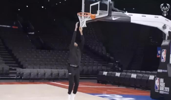 24直播网3月21日讯 字母哥要真想扣篮,真是防不住啊!从半场运球一步,就能完成炸裂扣篮,这就是字母哥变态之处。有时候觉得篮筐还是太低了,224cm的臂展的字母哥,只要轻轻一跳,就已经无限接近篮筐了。在正式的比赛中,字母哥凌空一跃,长臂一伸,篮球高过篮筐足足两个篮球的高度,然后重重地把篮球砸进篮筐,简单、直接并不失暴力美学!