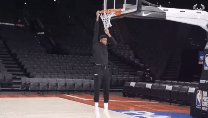 没有对比也就没有伤害。同在场上打4号位的字母哥和格里芬。两人因臂展悬殊,在扣篮后就会产生两种截然不同的画面。同在对阵热火的比赛中,字母哥在内线完成扣篮,双脚着地,扣完篮的单手则紧紧抓住篮筐。虽然篮筐被字母哥拽得向下倾斜不少。但能做到双脚落地,单手抓篮筐的球员,这样的球员在NBA真是寥寥无几!