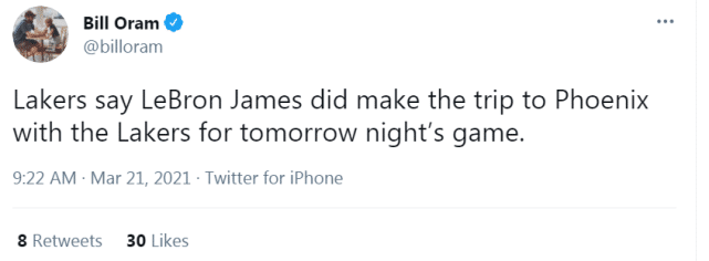 24直播网3月21日讯,据湖人官方的消息,詹姆斯将跟随湖人队飞往菲尼克斯,他们将背靠背对阵太阳。詹姆斯虽然不能出场,但就像他在社媒上说的那样,他不愿和队友分开。