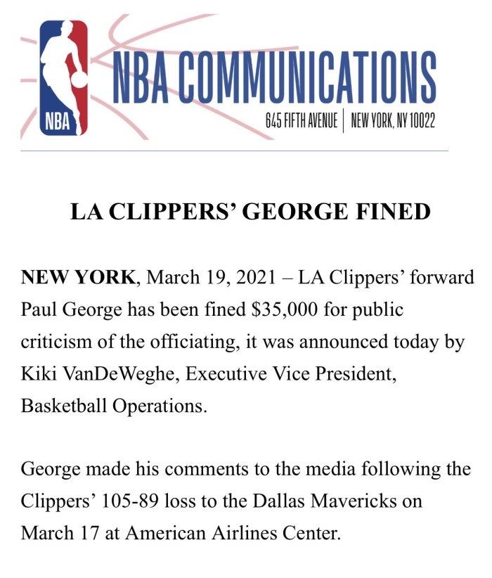 24直播网讯 北京时间3月20日,据记者ShamsCharania报道,快船前锋保罗-乔治因公开批评裁判被罚款35000美元,值得一提的是这不是第一次乔治喷裁判了!
