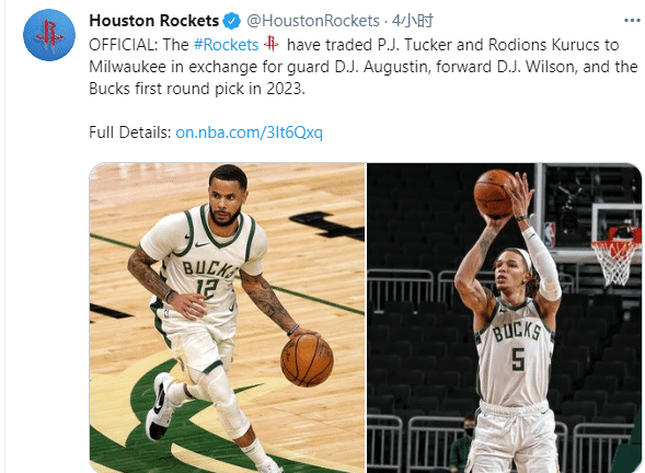 24直播网3月20日讯 火箭和雄鹿两队正式官宣大交易完成,火箭把塔克、库鲁茨和首轮选秀权(2022年)交易到雄鹿,得到DJ-奥古斯汀、DJ-威尔逊、2023年首轮选秀权和次轮换首轮的互换权;35岁塔克正式加盟雄鹿,如愿离开火箭并且加盟冲冠豪强。