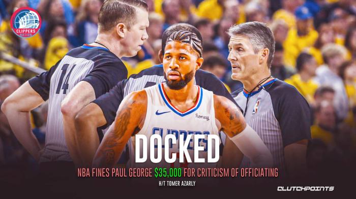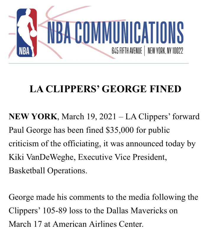 24直播网讯 北京时间3月20日,NBA联盟官方又开出一张罚单,快船巨星乔治因公平批评裁判而被罚款3.5万美元,此前乔治公开抱怨裁判的吹罚,直言除了假摔什么都做不了,对此很无能为力。