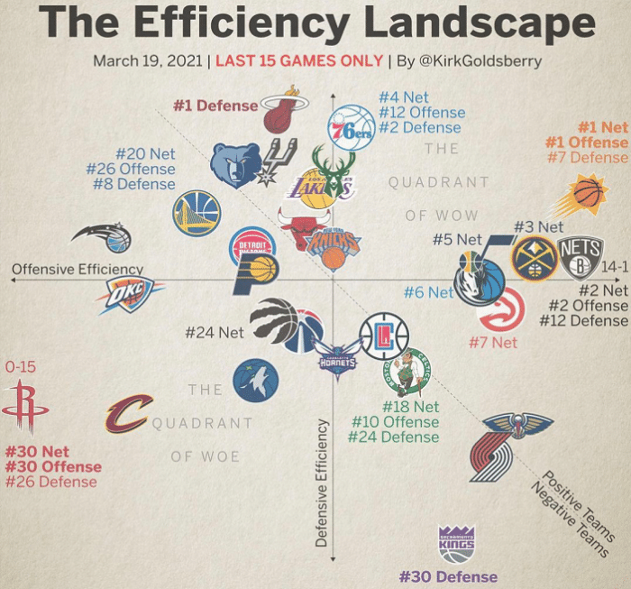 24直播网3月20日讯 近日媒体公布了最近15日内联盟各队的攻防效率值,截止时间是在当地的3月19日。上一次公布数据还是在全明星开始前,而这次的数据公布可以看出各队的进攻和防守在近期有很大的变化。