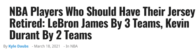 24直播网3月19日讯 对于NBA球员来说,退役球衣是一项很高的荣誉。以生涯至今的成就来看,现役哪些球星有资格退役球衣呢?北京时间3月18日,美媒Fadeaway World(FW)列出了23位球星的名单,其中,勒布朗-詹姆斯被认为有资格在3支球队退役自己的球衣。