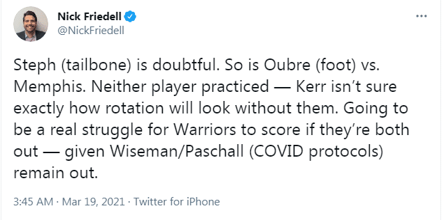 其中,库里在第三节结束前不慎摔倒,磕到场边的金属物,造成尾椎骨挫伤。乌布雷是脚部受伤。对于科尔来说,接下来一场比赛的排兵布阵遇到难题,如果两人都不打,再加上因健康安全协议被隔离的帕斯卡尔和怀斯曼,勇士将缺少四位轮换中的球员。