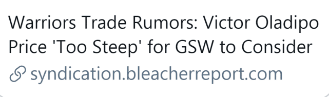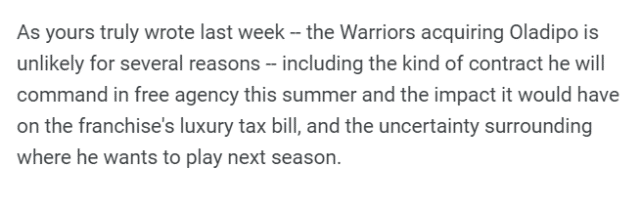 24直播网3月19日讯 勇士曾经有意得到火箭的奥拉迪波,但火箭的要价让他们放弃了继续深入谈判。北京时间3月19日,勇士前方记者Connor Letourneau证实,勇士确实向火箭询价奥拉迪波,但也只是停留在询价的阶段。火箭的要求太高了,他们想要2021年森林狼的首轮签或者怀斯曼,这一要价导致询价的中止。