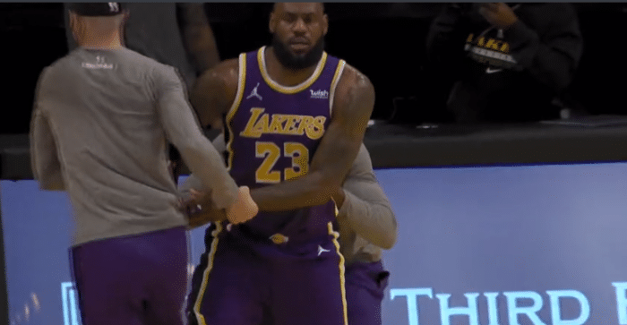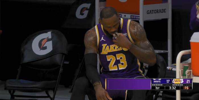 比赛中有一幕尽显詹姆斯的积极性——詹姆斯持球转身杀到禁区上篮得分,身体失去平衡后摔出底线,然后老詹队友冲过来拉起他,紧接着詹姆斯全力拼命回防,防守中被撞倒,一来一回两次摔倒,攻防两端太拼命。