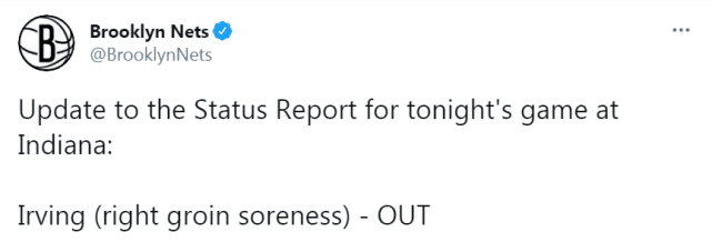 除了杜兰特和格里芬继续休战,欧文也不在对步行者的出场名单上。由于右侧腹股沟酸痛,欧文无缘对阵步行者,这是欧文本赛季第一次出现腹股沟位置的伤病,篮网方面也相当重视。纳什表示欧文的伤情并不严重,球队让他休息一场,只是出于谨慎考虑。