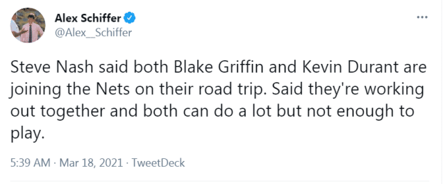 球迷们纷纷为杜兰特送上祝福,并表示以篮网目前的战绩,杜兰特完全可以安心养伤,只是希望球队方面没有隐藏伤情。纳什还表示,格里芬和杜兰特都加入了篮网的客场之旅,两人一起训练,都已经可以完成很多内容,只是还不足以达到参赛的要求。