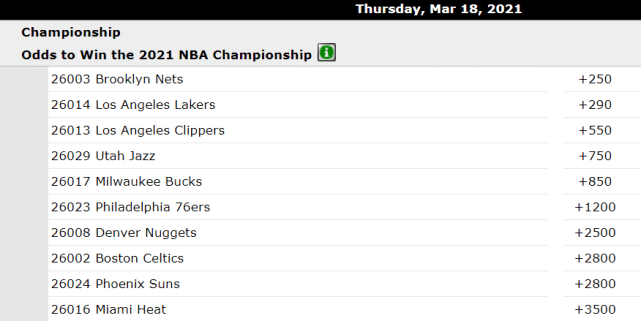 篮网最新的夺冠赔率是+250,位居联盟第一。杜兰特受伤后,篮网的战绩没有受到影响,哈登率领这支球队依然保持很高的胜率。对步行者一战,欧文腹股沟酸痛未能出场,哈登顶住压力,帮助球队击败步行者,完成16分逆转。哈登轰下40分15助攻10篮板的全面数据。篮网成为冲冠头号热门,哈登获得常规赛MVP的呼声也越来越高。