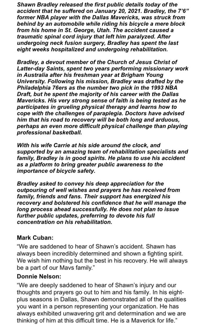 独行侠官方声明:48岁肖恩-布拉德利是在2021年1月21日在自己家(犹他州圣乔治)附近骑自行车时,被一辆汽车从后面撞倒。此次事故让他遭遇创伤性脊髓损伤导致瘫痪;目前布拉德利已经接受了颈部修复手术,过去8周一直在住院接受治疗。
