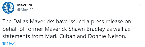 独行侠总经理尼尔森表示听到肖恩(布拉德利)受伤的消息,我们深感悲痛,我们为他和他的家人祈祷。在这个艰难的时刻,我们挂念着他,他终生都是一个独行侠(小牛)人。