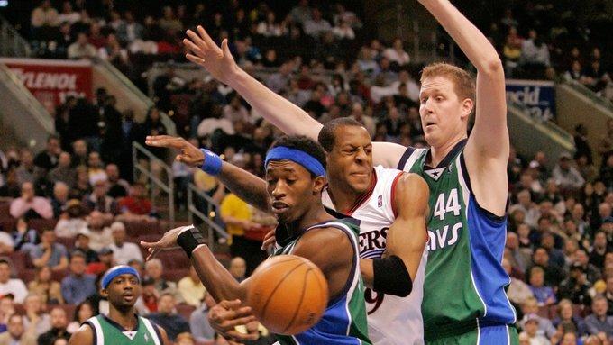 布拉德利外号大竹竿,是1993年的榜眼秀,身高2米29,NBA生涯出战过832场常规赛和43场季后赛,为76人、篮网和独行侠效力过,是1997年的盖帽王,场均得到8.1分6.3篮板2.5盖帽,曾因惨遭麦迪骑扣而出名;年仅48岁,大竹竿因车祸导致瘫痪,但愿他早日痊愈。