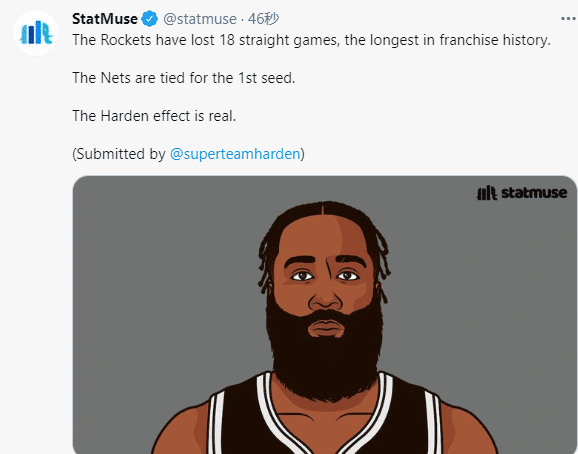 哈登带领篮网打出统治力,与此同时火箭已经长达42天不赢球,输给勇士后惨遭队史最长的耻辱18连败;对此美媒StatMuse发推写道:篮网并列东部第一,火箭18连败队史最长,哈登效应太真实了。