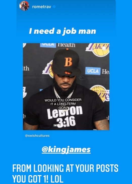 这是在社交媒体上,詹姆斯的高中队友Romeo Travis转发社交媒体,“@我需要一份工作,哥们!@詹姆斯”