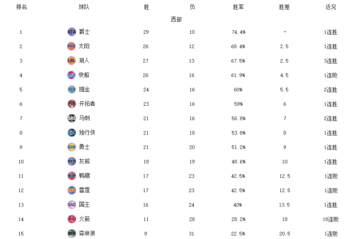 24直播网3月18日讯 今天进行的NBA常规赛中,一共有7支西部球队出战,其中包括了国王险胜奇才、马刺上演23大逆转击败公牛、掘金大胜黄蜂、灰熊险胜热火、火箭不敌勇士吞下队史最长连败的苦果,独行侠复仇快船。接下来我们来看看西部最新排名: