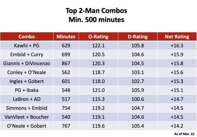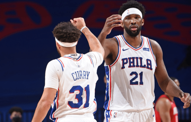 排名第二的是费城的恩比德和塞斯-库里。一位是内线大杀器,一位是外线神射手,他俩同场时,进攻效率120.5,防守效率104.6,百回合能赢15.9分。