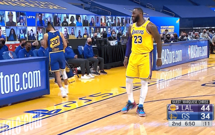 下半场的比赛开始后,勇士队这边的进攻打得不错,但是在防守端他们却不能限制住湖人队,两队分差一度来到了20分,这一节的比赛莫里斯出现了小伤病,两队分差始终在20分左右,勇士苦苦追分无果,场上球员看着十分的沮丧,三节比赛打完的时候,湖人93:73领先勇士20分。末节比赛湖人一度将分差扩大到了28分,勇士这边并没有组织起什么有效的反击,帕斯卡尔三分不中,詹姆斯抢下篮板拿下三双数据,库兹马抛投命中,詹姆斯主动犯规下场,也有球迷调侃道:老詹刷数据实锤,强迫症舒服了,勇士惨败湖人,由于比赛早早的花了,库里也没有回到场上,他17投9中得到了27分3篮板2助攻3抢断的数据。詹姆斯22分10板11助攻。