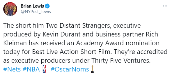 24直播网讯 恭喜!杜兰特又有新成就,据篮网记者报道,杜兰特担任制片人制作的短片《Two Distant Strangers》已经获得奥斯卡金像奖最佳真人短片(提名);当初科比获得奥斯卡小金人时,杜兰特曾表示篮球运动员获得奥斯卡,这代表了很多东西。
