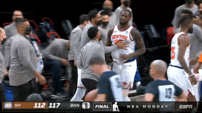 24直播网讯 北京时间3月16日,篮网险胜尼克斯,欧文轰下34分,哈登狂砍21分15篮板15助攻大号三双,关键时刻两罚杀死比赛,最后20秒足足打了15分钟,多次出现争议判罚,尤其是比赛结束后,兰德尔不满判罚,情绪失控,冲过来想找裁判理论,所幸被队友拦住,离场时他气得踢翻椅子。
