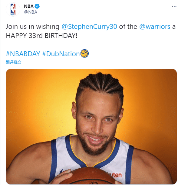 NBA官方晒出库里留着一头地垄沟发型的帅照,发推写道:让我们一起恭喜库里33岁生日快乐;勇士官方的祝福想当简洁明了:生日快出来,斯蒂芬-库里。