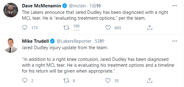 湖人官方宣布:除了右膝挫伤,杜德利还被诊断为右膝内侧副韧带撕裂,他正在评估自己的治疗方案,并将在适当的时候给出回归的时间表;此前湖人官方才晒出杜德利随队飞往湾区挑战勇士的登机照,对着镜头十分抢镜,岂料他惨遭右膝韧带撕裂的大伤。