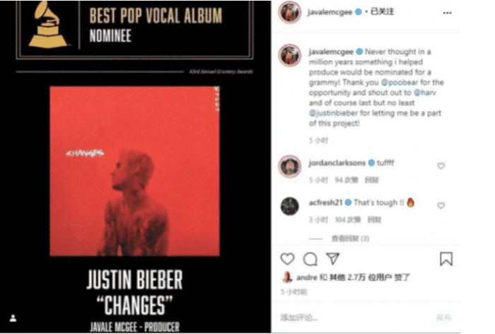 在去年11月底,麦基通过社交媒体兴奋的宣布自己参与制作的音乐专辑《Changes》被格莱美提名“最佳流行演唱专辑奖”,这张专辑的是贾斯汀-比伯在2020年情人节发布的,第六首歌曲的名字是《Available》,这首歌就是麦基制作。