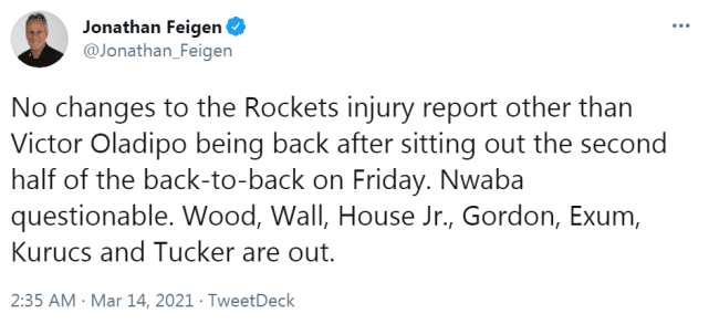24直播网讯 北京时间3月14日,火箭公布了球队的最新伤情,和一天前相比,除了奥拉迪波复出之外,其余情况相同。戈登(右腹股沟)、豪斯(右膝)、沃尔(左膝)、伍德(右踝)都无法出场,库鲁茨和埃克萨姆也都有伤在身,塔克继续等待交易,努瓦巴(右腕)出战成疑。