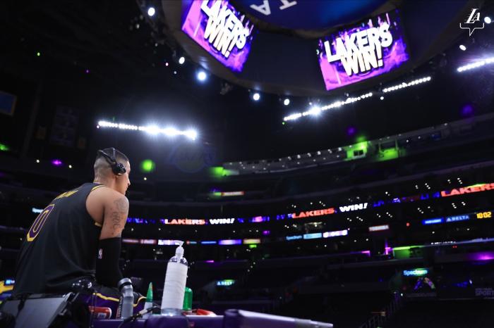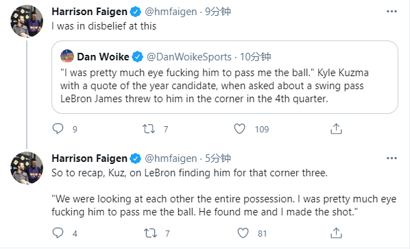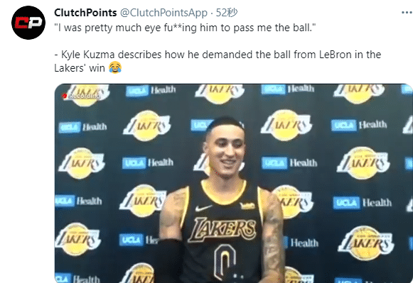 赛后库兹马表示只要球在自己手里,就可以去做任何球队需要我去做的事情,谈到末节詹姆斯助攻自己投进关键三分球时,库兹马表示:我们一直相互看着对方,我一直瞪着詹姆斯,想让他赶紧把球传给我,然后他找到了我,我把球投进;说完这番话,库兹马忍不住笑出声来,采访记者也大笑起来。