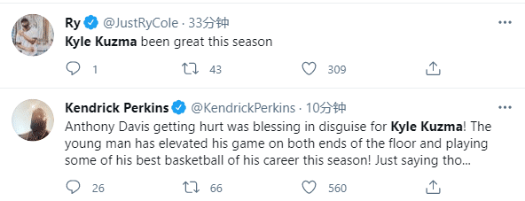 名嘴帕金斯第一时间发推:浓眉的受伤让库兹马卸下了伪装,这个年轻人在攻防两端都表现出色,本赛季他打出了职业生涯最好的赛季。