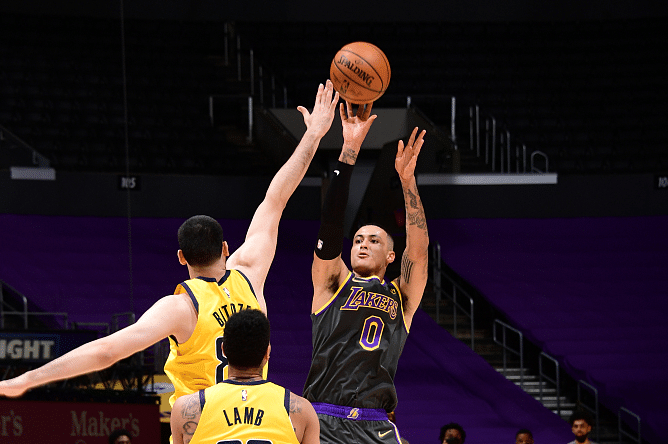 湖人这场球凭什么能赢呢?首先库兹马的爆发肯定是最关键的,特别是库兹马连续的两个三分球以及快攻上篮,让双方的分差瞬间变成了5分,这也让步行者的心态有些失衡,进攻端出现了急躁的情况。