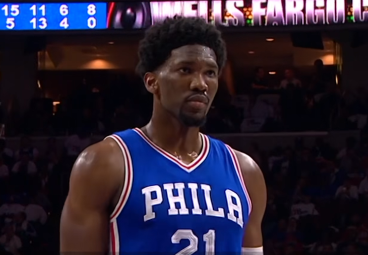 76人球星恩比德在一次进攻中对着马修斯完成隔扣后痛苦倒地,捂着自己的左膝。