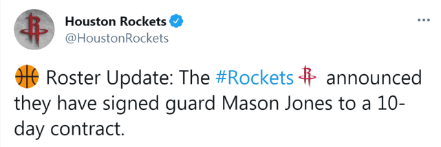24直播网3月13日讯 北京时间3月13日,火箭官方宣布,他们已经和旧将梅森-琼斯签下一份10天短合同。4天前,为了给安东尼-兰姆腾出空间,火箭裁掉了琼斯。如今,火箭重新签下这位22岁的射手,更多是为了凑足联盟规定的最低上场人数。